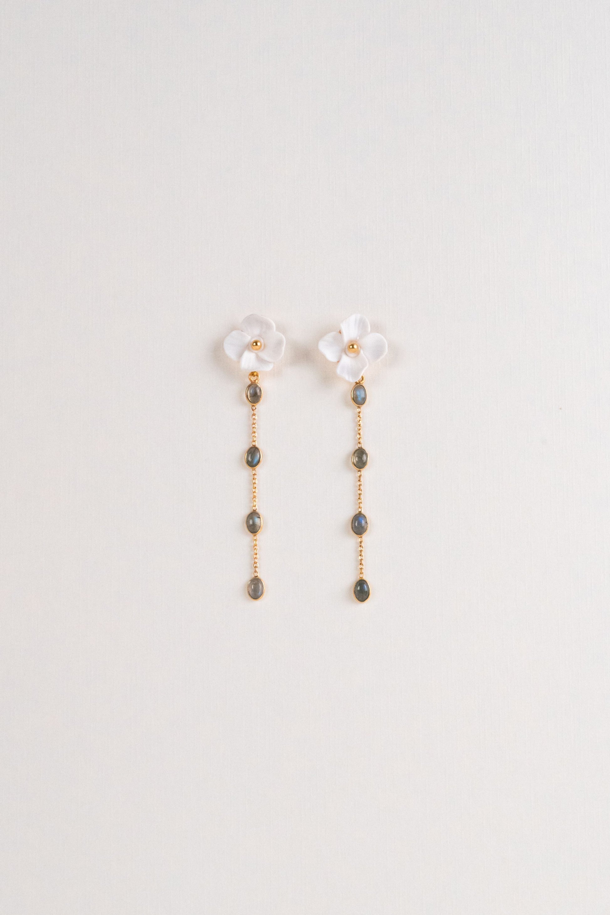 Pendientes largos con diseño floral en tono blanco y acabado en baño de oro. Desde el centro de la flor caen delicadas cadenas doradas adornadas con piedras naturales de destellos iridiscentes, que aportan movimiento y luz a cada paso. Una joya elegante y sofisticada, ideal para ocasiones especiales.